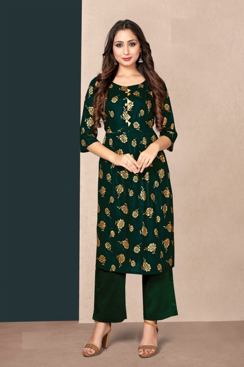 Bottle Green Foil Print Long Kurtis 2053