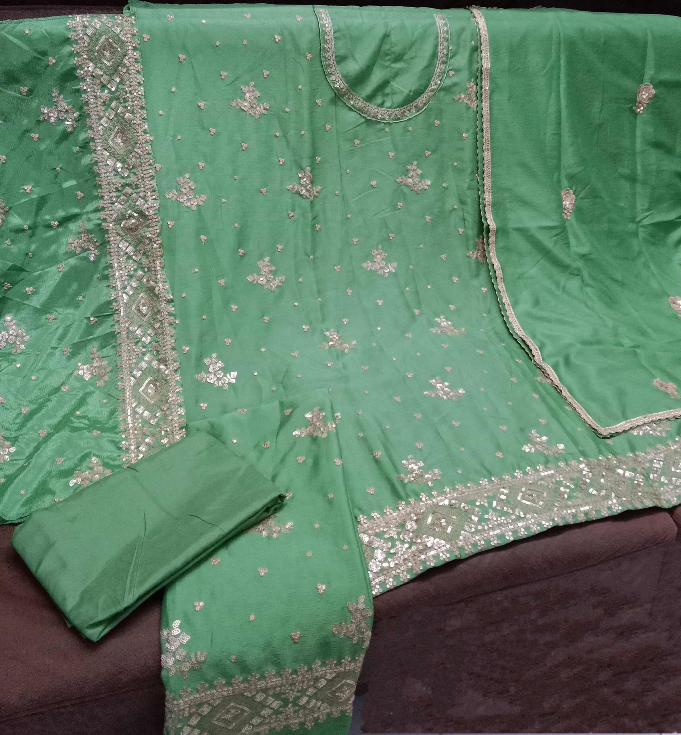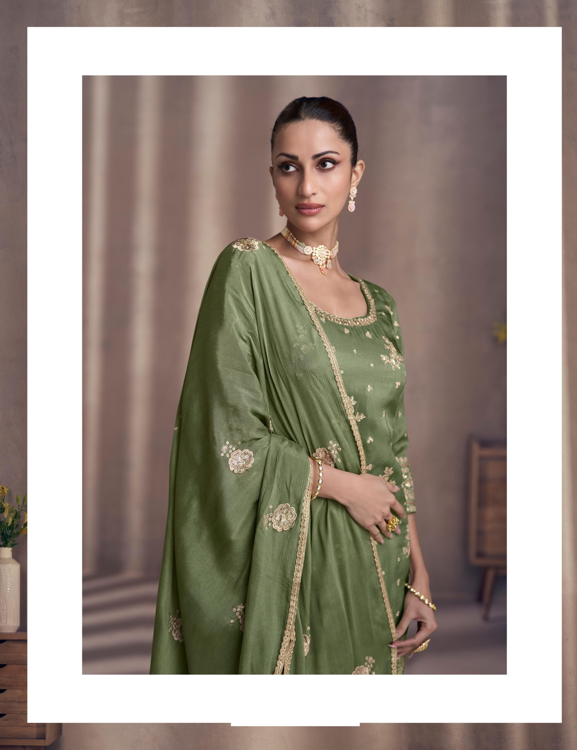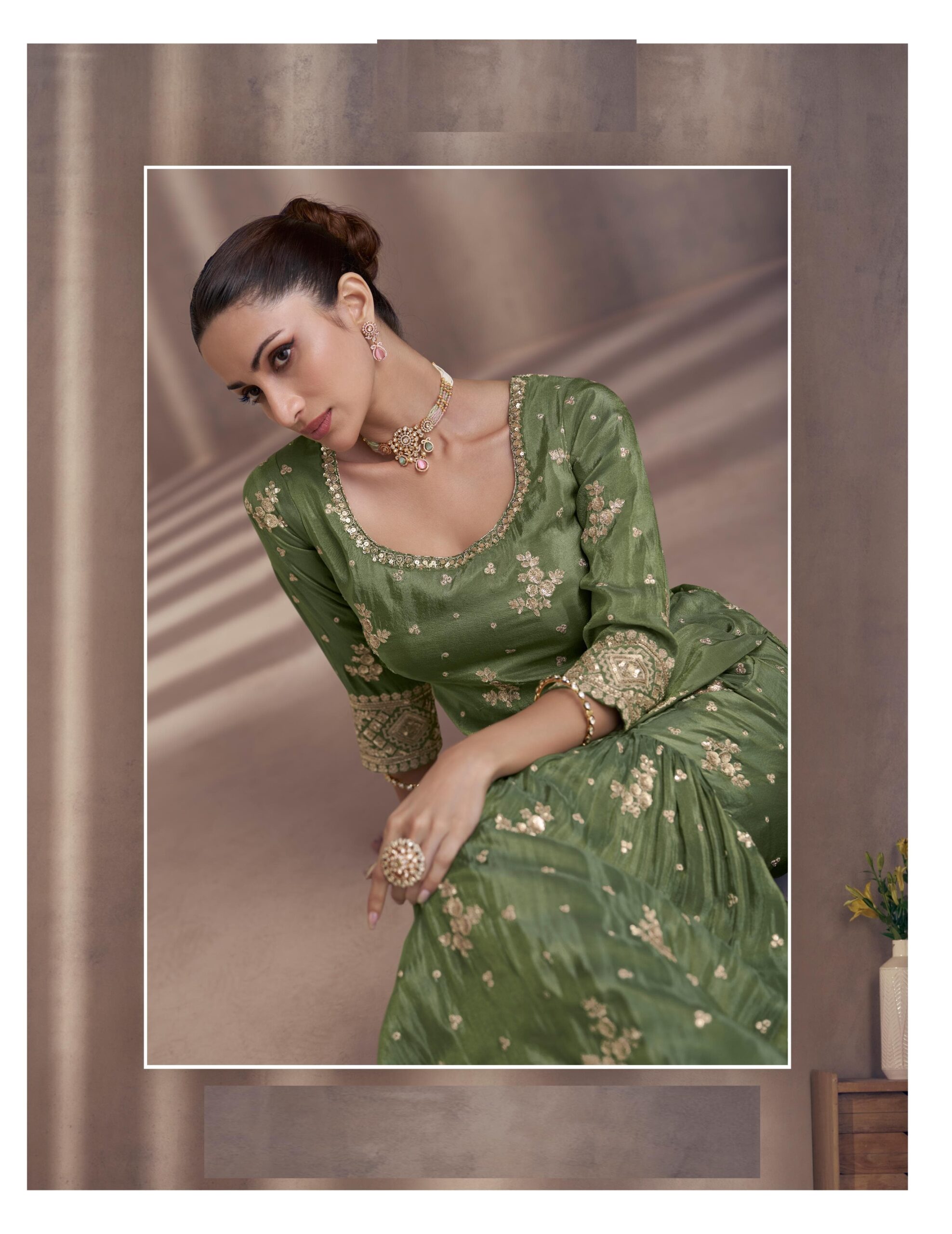Step into elegance with this stunning green sharara suit crafted from premium Chinon silk. Featuring intricate heavy embroidery, perfect for wedding wear, party wear, and festive occasions. A must-have traditional Indian outfit for women who love elegance and detail.
