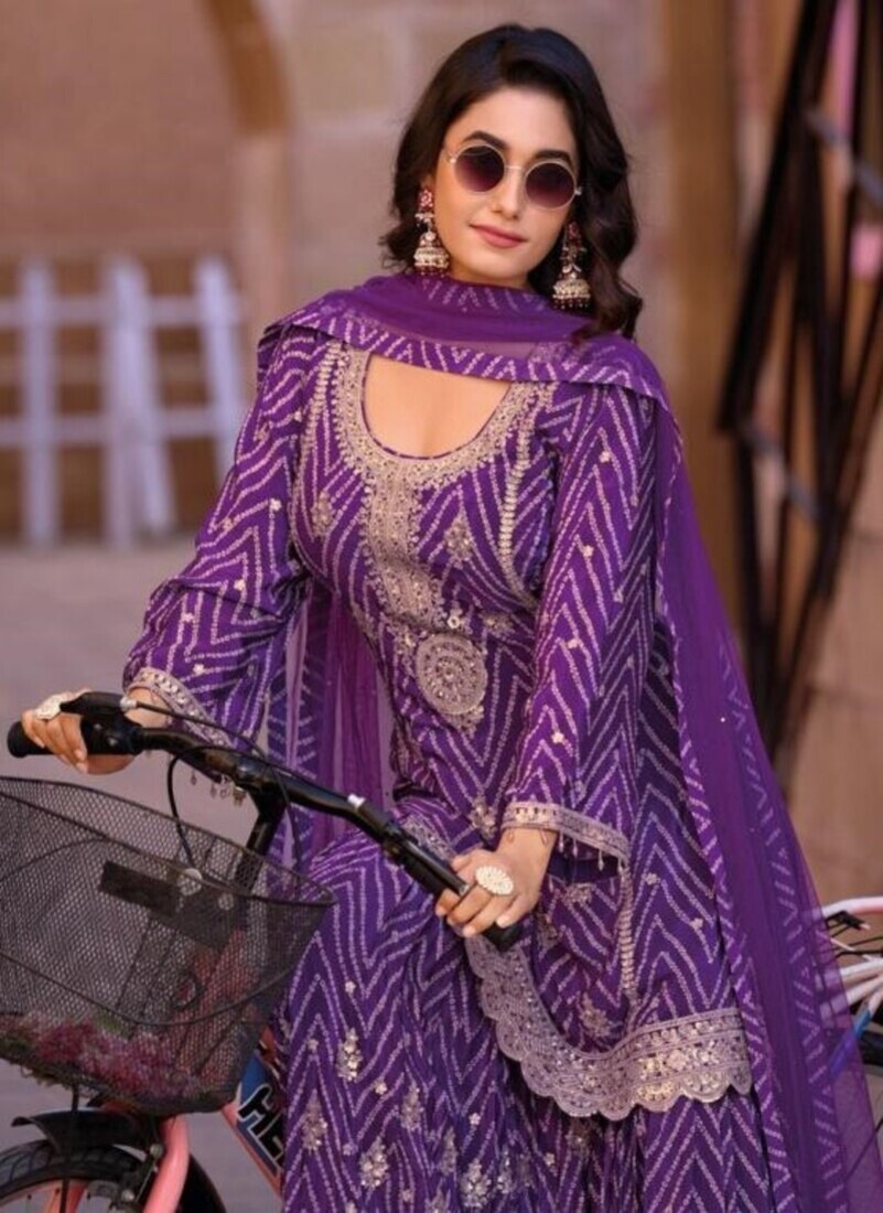Dark Purple Bandhani Print Chinon Silk Party Wear Free Size Gharara Suit 4002