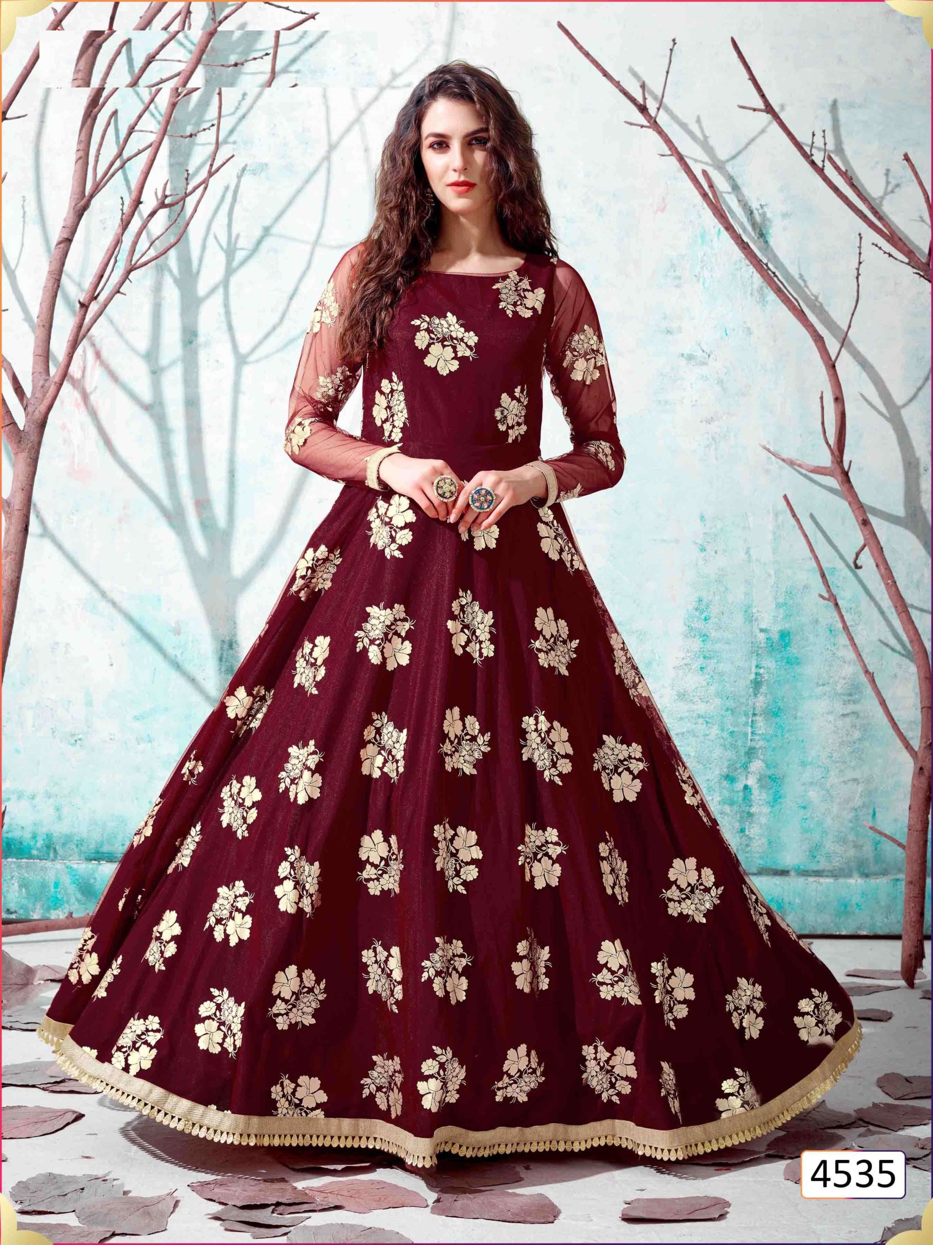 Party Wear Maroon Net Gown 4535