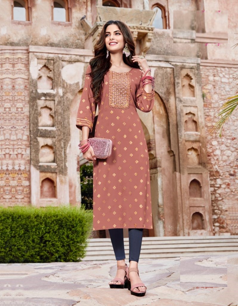Pure Rayon Gold Print & Heavy Embroidery Straight Fit Kurti 5005