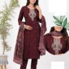 Red Roman Silk Full Stitch Embroidery Plus Size Suits with Muslin Dupatta: Exquisite red Roman silk suit with embroidery and muslin dupatta, perfect for special occasions. Available for Canada and USA shipping.
